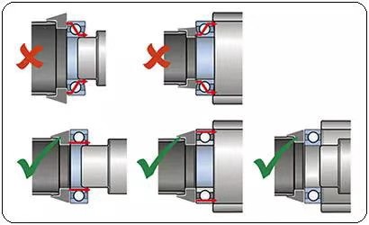安裝壓力應(yīng)直接施加于過盈配合的軸承套圈端面上,否則會(huì)在軸承工作表面上造成壓傷,導(dǎo)致軸承很快地?fù)p壞。