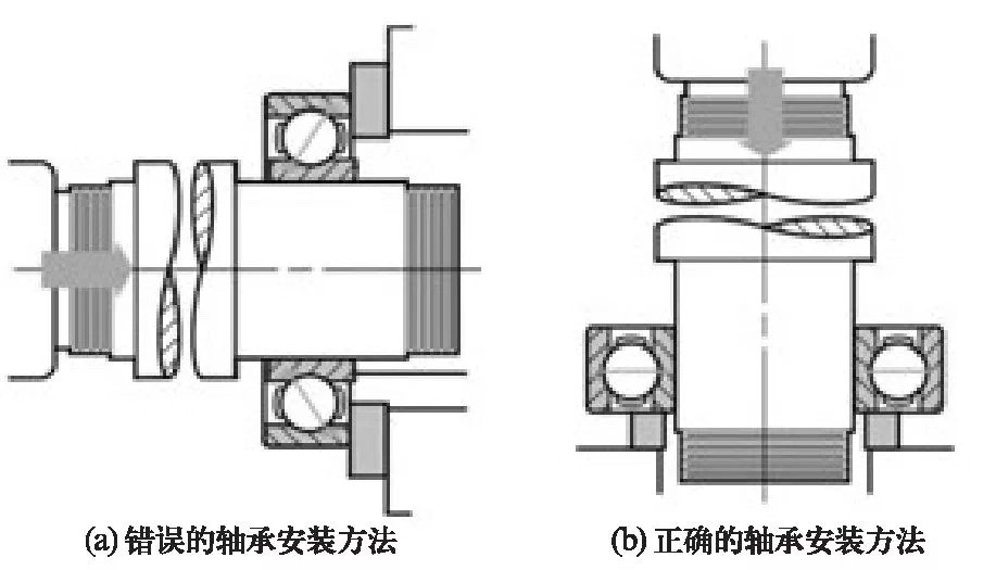 軸承安裝裝反了,不僅軸承工作不正常,且各配合面會(huì)遭到嚴(yán)重磨損。由于軸圈與座圈和區(qū)別不很明顯,裝配中應(yīng)格外小心,不能裝反。