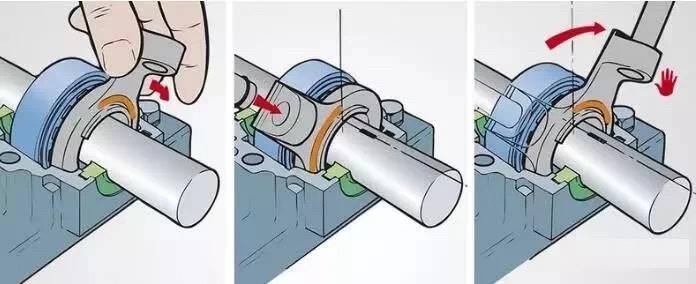 安裝時(shí)對軸承施加的作用力,絕不可通過滾動(dòng)體從一個(gè)軸承圈傳遞到另一個(gè)軸承圈,否則可能會(huì)對滾道造成損壞。但在任何情況下,都不可以直接敲擊軸承圈、保持架、滾動(dòng)體或密封件。